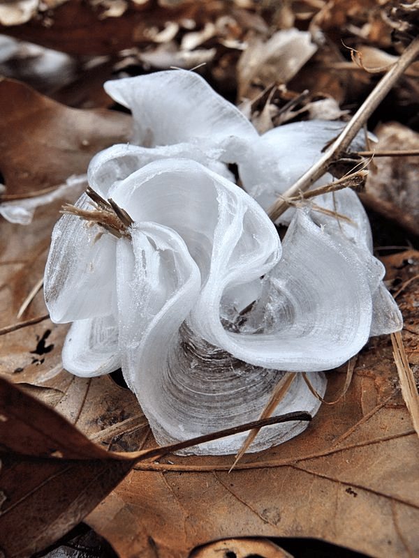 Frost Flowers: Between fall and winter when the ground is still warm, but the air is freezing, plant sap expands and pushes out of cracks in the stem to form ribbon-like structures.